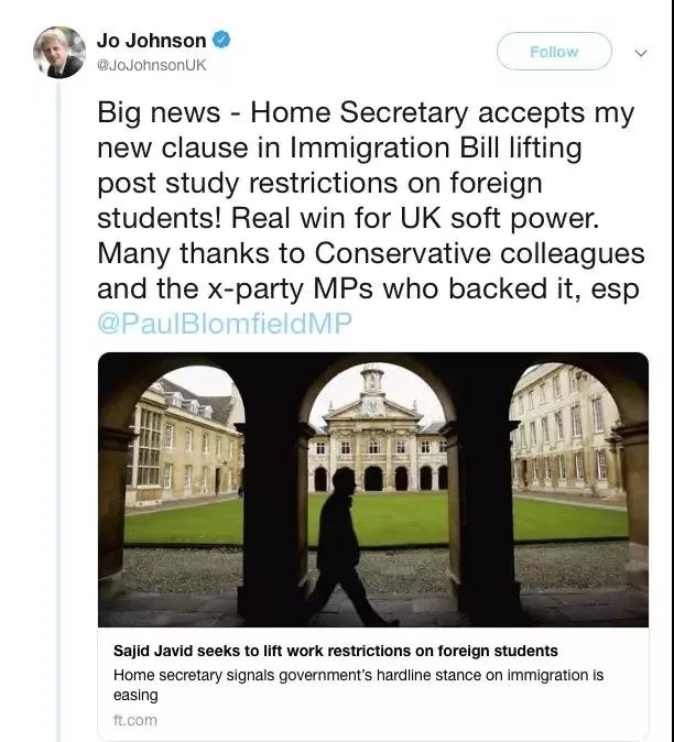 英國(guó)議員Jo Johnson提議留學(xué)生畢業(yè)后應(yīng)當(dāng)自動(dòng)獲得兩年簽證,而正在競(jìng)選首相的鮑里斯·約翰遜(Boris Johnson)、內(nèi)政大臣薩伊德·賈維德(Sajid Javid)、前財(cái)政大臣肯·克拉克(Ken Clarke)都表示了對(duì)此新政策的支持。