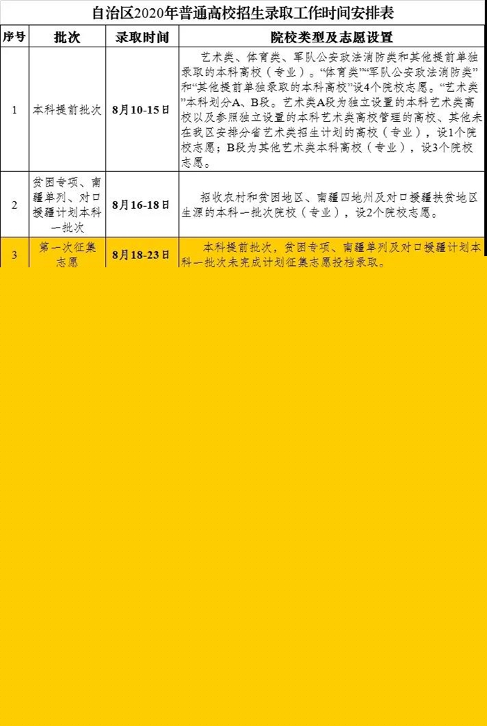 自治區(qū)2020年普通高校招生錄取工作將于8月10日正式開始,預(yù)計(jì)9月27日結(jié)束。錄取共分本科提前批次,貧困專項(xiàng)、南疆單列及對(duì)口援疆計(jì)劃本科一批次,高校專項(xiàng)計(jì)劃批次(設(shè)在本科一批次前),本科一批次,貧困專項(xiàng)、南疆單列及對(duì)口援疆計(jì)劃本科二批次,本科二批次,高職(??疲┨崆芭?,高職(??疲┡蔚?個(gè)批次進(jìn)行。錄取期間共安排了5次征集志愿?!叭I呗殹迸闻c高職(專科)提前批次錄取同時(shí)進(jìn)行。