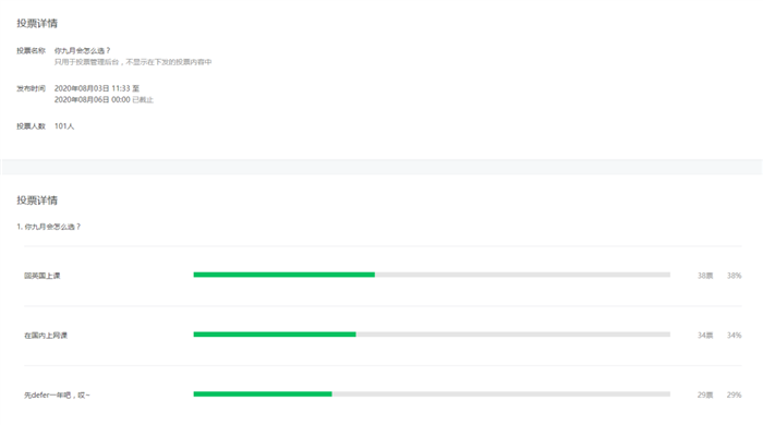 在之前我曾經(jīng)看到網(wǎng)上做過(guò)一個(gè)調(diào)查,九月你是不是要回英國(guó)上課。在參與的回答的100多名同學(xué)中,我們可以看到十分平均的數(shù)據(jù):